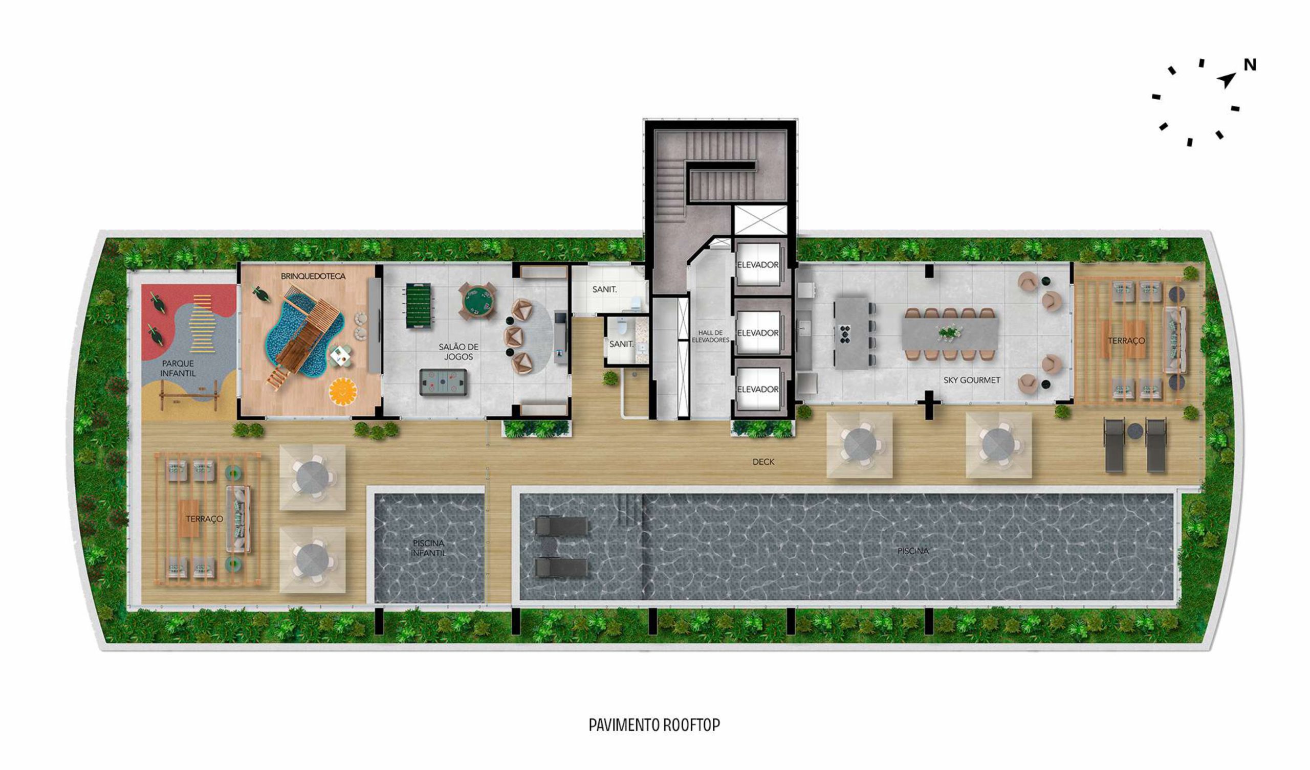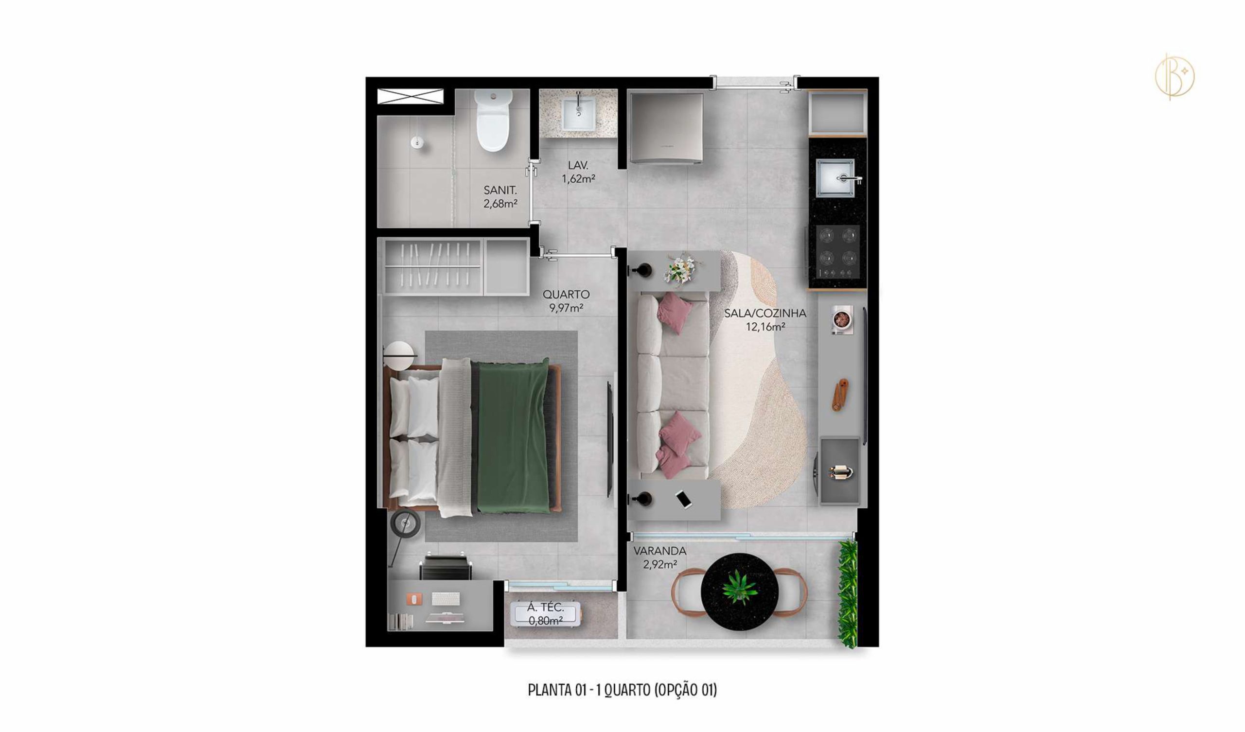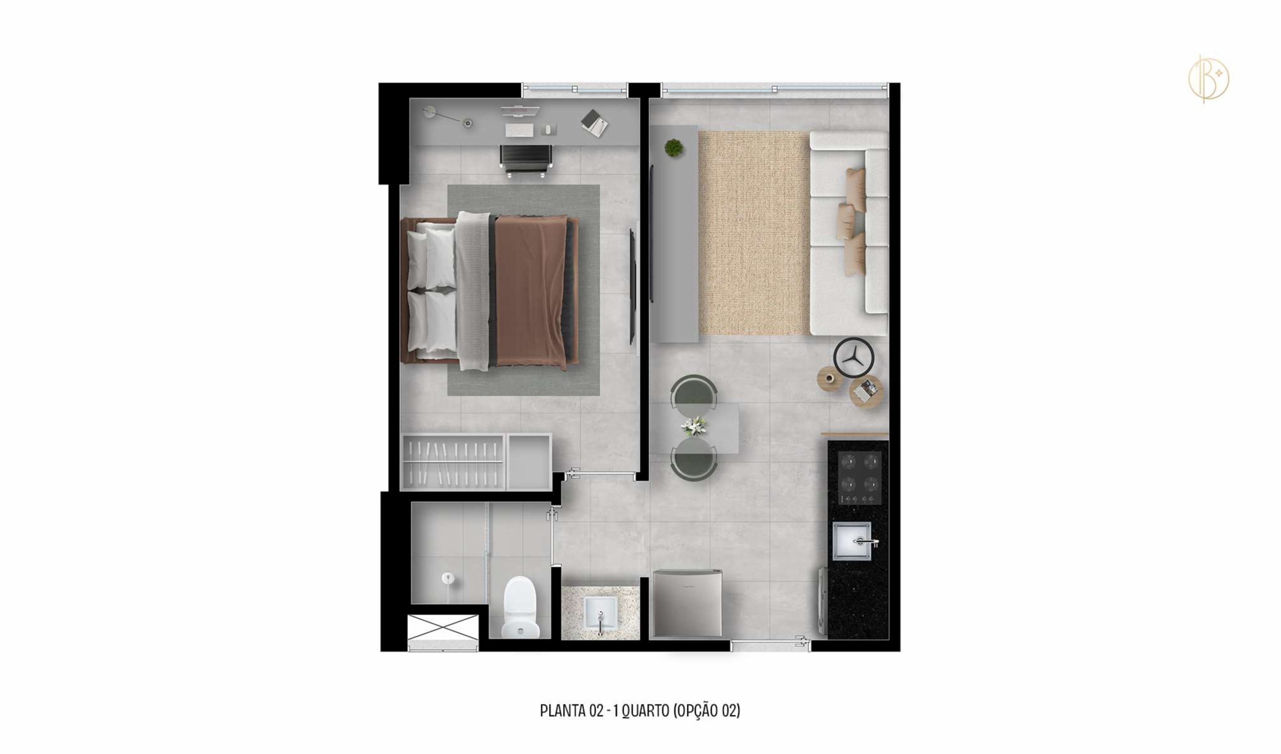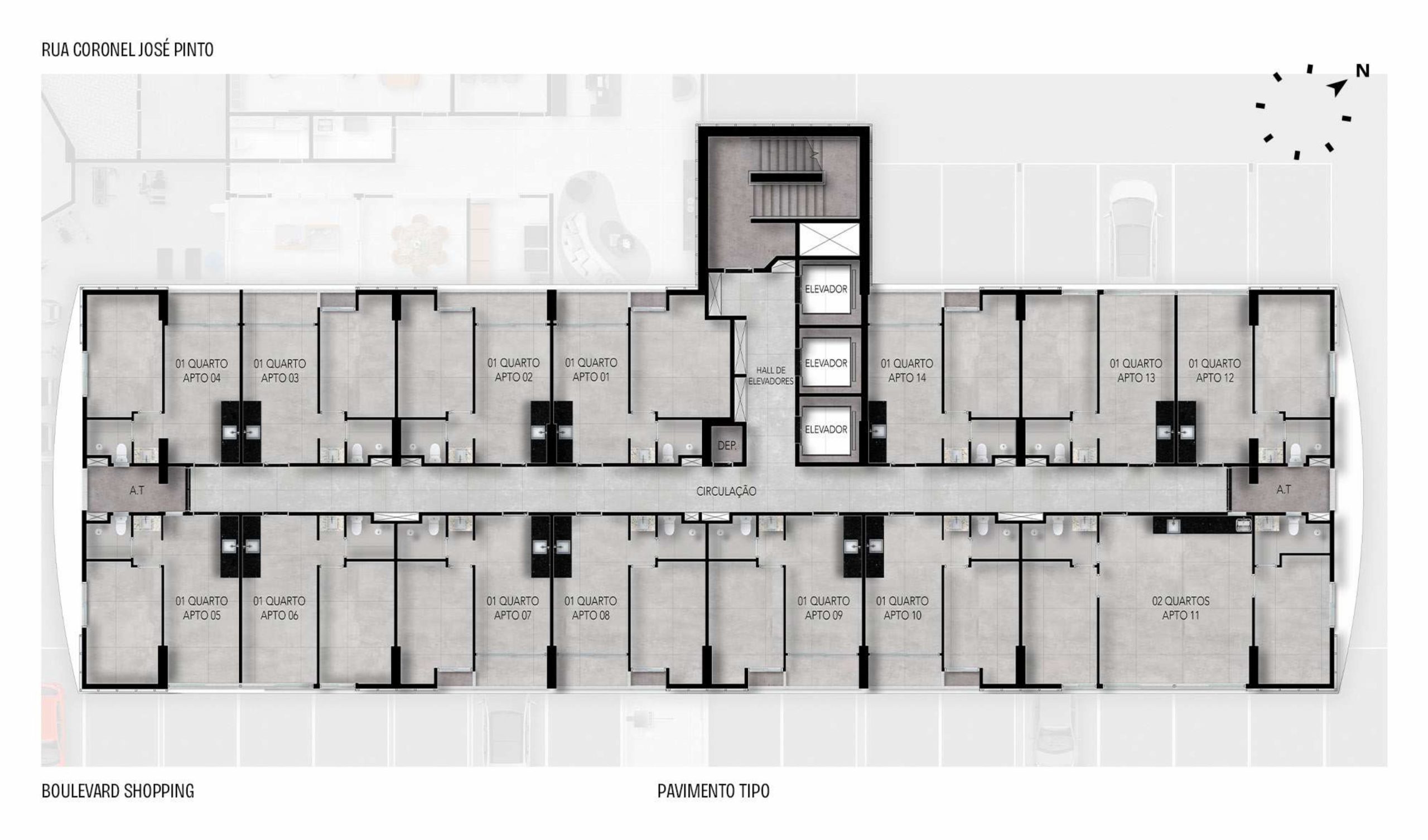 • 84 unidades com sala/cozinha, quarto e sanitário privativo com área técnica;