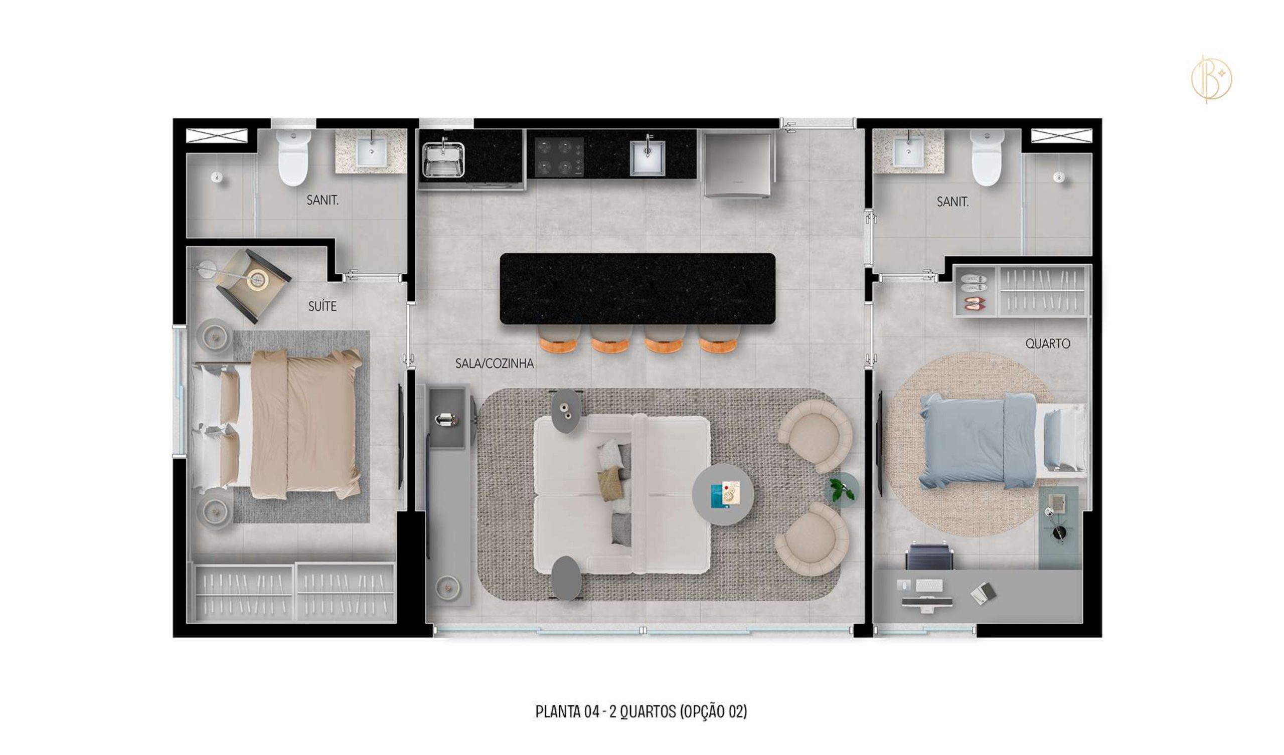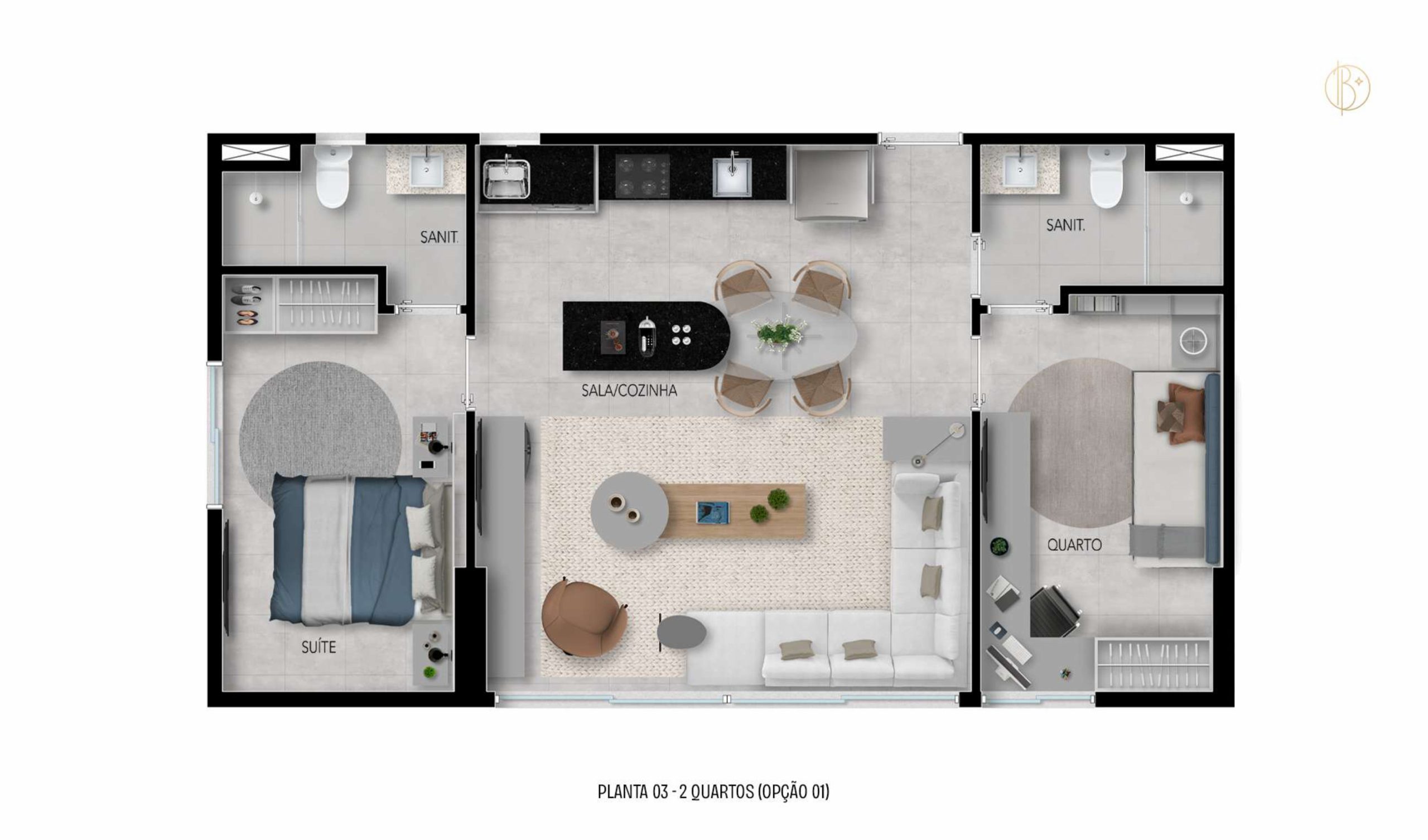 • 21 unidades com sala/cozinha, dois quartos, sendo uma suíte e sanitário social.